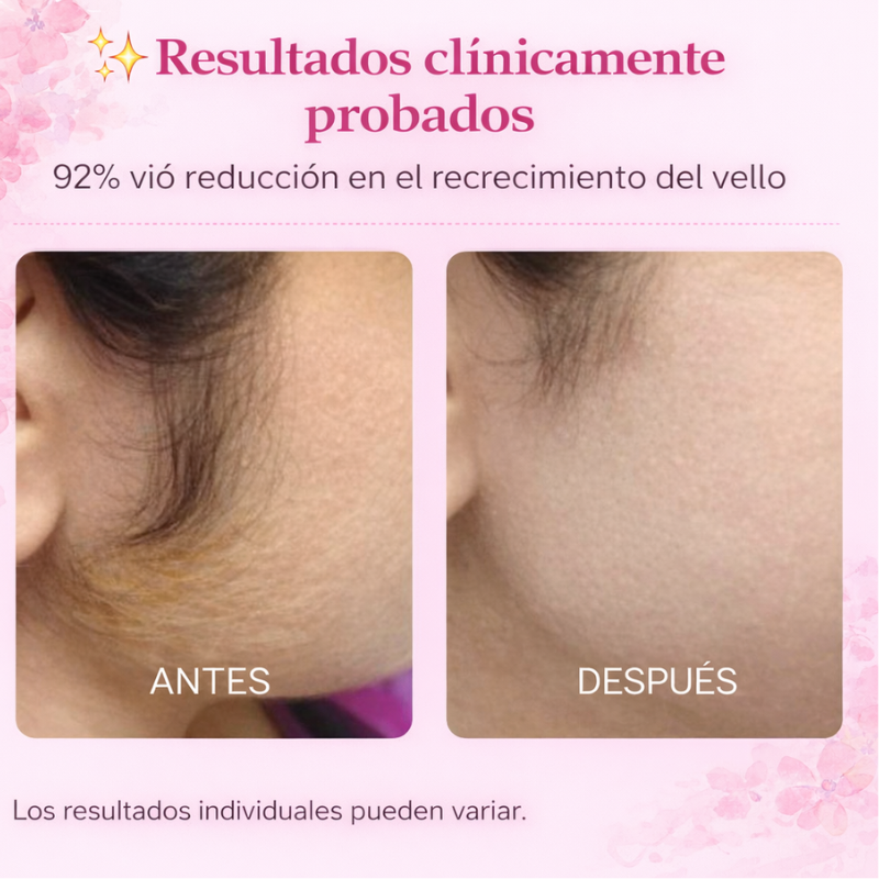 Durante el primer mes, el sérum comienza a penetrar en el folículo para interrumpir las señales de crecimiento del vello desde la raíz. Hacia la semana 8, muchas usuarias observan una disminución visible en el grosor y la frecuencia del crecimiento. Con una aplicación constante hasta la semana 14, la piel se ve más suave, uniforme y prácticamente libre de vello, sin irritación ni tratamientos láser.